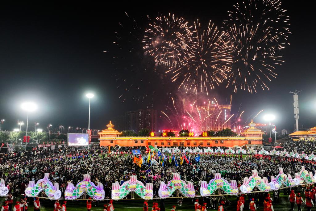 2025年1月4日,人們?cè)谫F州榕江縣舉辦的“村超村晚”活動(dòng)中表演非遺節(jié)目“多耶”(無人機(jī)照片)。新華社記者 楊文斌 攝