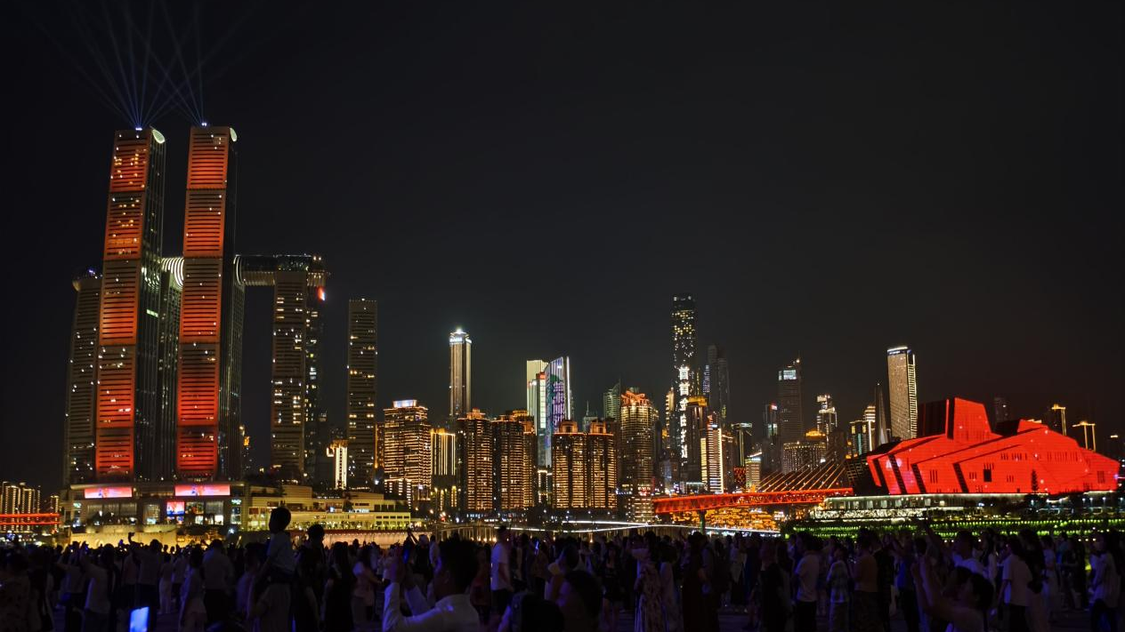 像徐先生一樣的游客數(shù)不勝數(shù),一場(chǎng)無(wú)人機(jī)燈光秀,為“兩江四岸”的天臺(tái)店鋪帶來(lái)了空前的流量。在南濱路、長(zhǎng)濱路、朝天門(mén)、江北嘴等地的江岸邊,以及各個(gè)高樓大廈的觀景臺(tái)上,擠滿了來(lái)自五湖四海的游客。