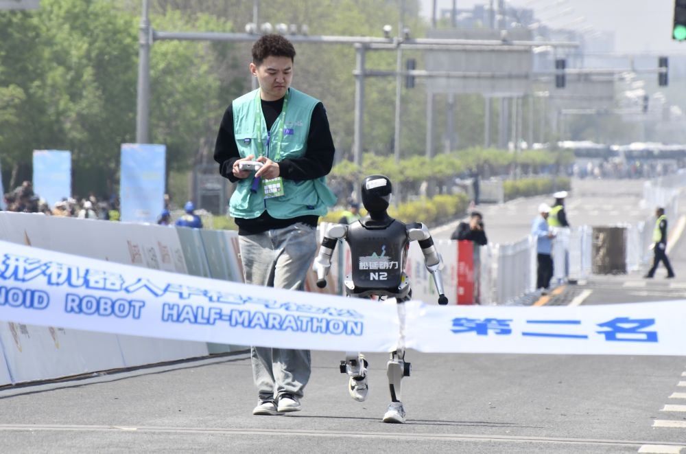 4月19日,在2025北京亦莊半程馬拉松暨人形機(jī)器人半程馬拉松比賽中,小頑童隊(duì)選手松延動(dòng)力N2(右)沖向終點(diǎn)。新華社記者李欣 攝