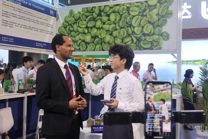 2025年6月14日,在第四屆中國-非洲經(jīng)貿(mào)博覽會上,埃塞俄比亞駐華公使內(nèi)比尤·穆罕穆德參加現(xiàn)場直播帶貨。新華社記者 周昊瑾 攝