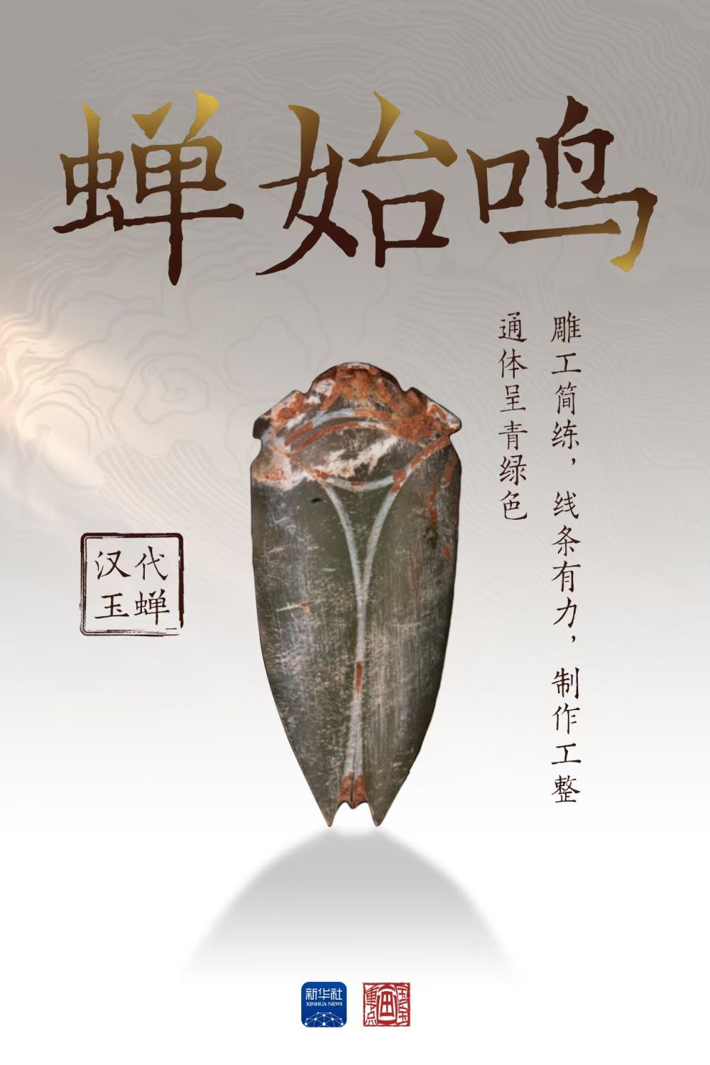 這件漢代玉蟬通體呈青綠色,盛夏的氣息撲面而來。《禮記·月令》記載:“仲夏之月,蟬始鳴”,古人發(fā)現(xiàn)夏至之日陽氣達到極盛,蟄伏地底多年的蟬若蟲會破土羽化宣告盛夏來臨,這是自然界的昆蟲“節(jié)氣預(yù)報”。