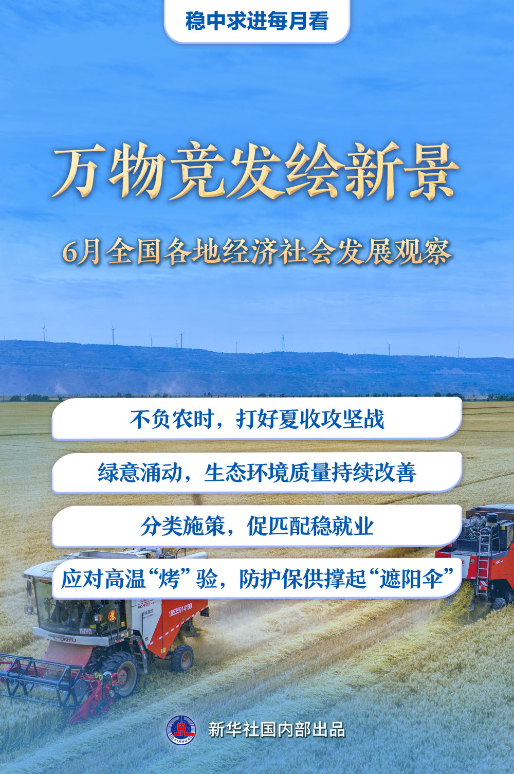 6月仲夏,萬(wàn)物豐茂。廣袤農(nóng)田上,“三夏”生產(chǎn)進(jìn)入關(guān)鍵階段;綠水青山間,低碳發(fā)展不斷繪就新圖景;全力穩(wěn)就業(yè),政府、企業(yè)與高校同頻共振;高溫“烤”驗(yàn)下,做好各項(xiàng)保障工作……上半年收官之月,各地各部門統(tǒng)籌推進(jìn)穩(wěn)增長(zhǎng)、促改革、惠民生舉措,推動(dòng)經(jīng)濟(jì)社會(huì)沿著高質(zhì)量發(fā)展之路穩(wěn)步前行。