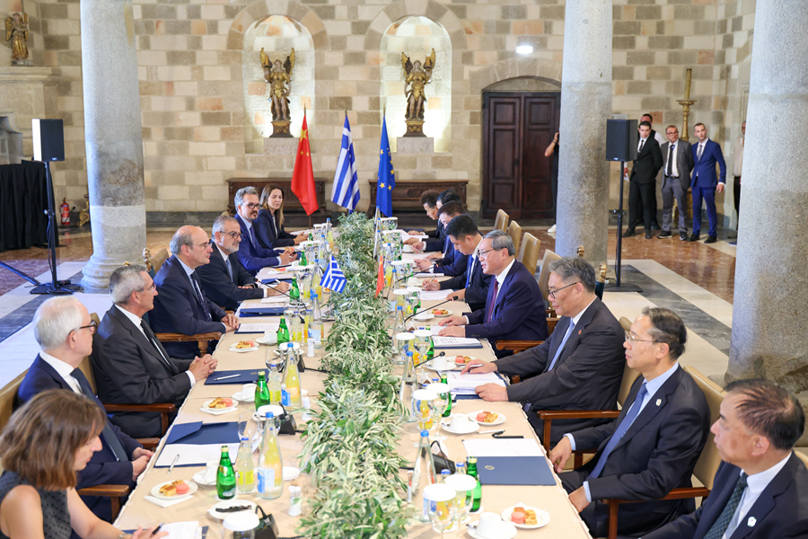 當?shù)貢r間7月4日下午,國務(wù)院總理李強在希臘羅德島會見希臘副總理哈齊達基斯。新華社記者 劉彬 攝