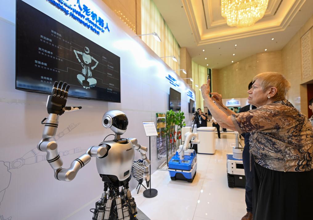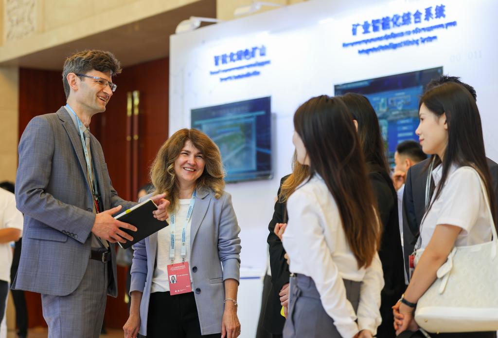 7月11日,參會嘉賓在2025上合組織數(shù)字經(jīng)濟(jì)論壇互動體驗區(qū)與參展企業(yè)工作人員交流。新華社記者 孫凡越 攝