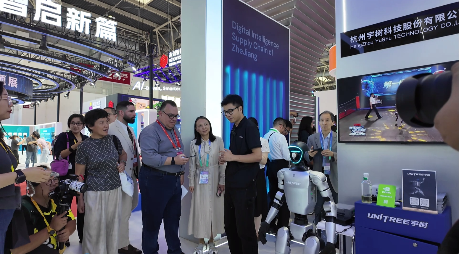 “創(chuàng)新味”還體現(xiàn)在機(jī)器人的身影多了。在英偉達(dá)展臺(tái)、湖北人形機(jī)器人展區(qū),以及參與浙江“數(shù)智潮涌 龍躍浙里”主題專區(qū)的宇樹(shù)科技和強(qiáng)腦科技展臺(tái),靈巧手、機(jī)器狗、工業(yè)機(jī)器人、人形機(jī)器人等產(chǎn)品吸引著不少中外觀眾上前互動(dòng)體驗(yàn)。