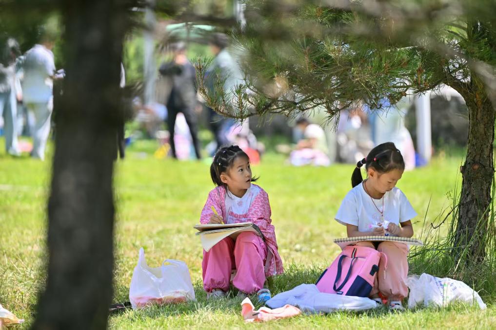 7月22日,兩名小學生在青海省大通縣邊麻溝花海景區(qū)內(nèi)參加暑期美術(shù)寫生研學活動。新華社記者 孫瑞博 攝