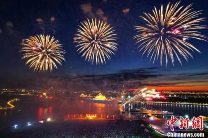 7月5日晚,“夜上津門(mén)·焰遇航母”大型沉浸式夏日音樂(lè)焰火秀在天津泰達(dá)航母主題公園上演。本次焰火秀以“煙花星球”為主題,吸引了許多市民和游客沉浸式體驗(yàn)視聽(tīng)盛宴。(無(wú)人機(jī)照片)中新社記者 佟郁 攝