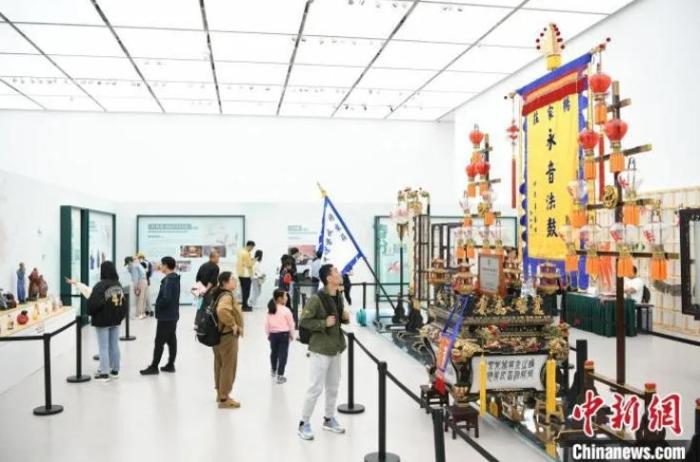 2024京津冀非物質(zhì)文化遺產(chǎn)聯(lián)展上,觀(guān)眾參觀(guān)津門(mén)法鼓·楊家莊永音法鼓。中新社記者 佟郁 攝