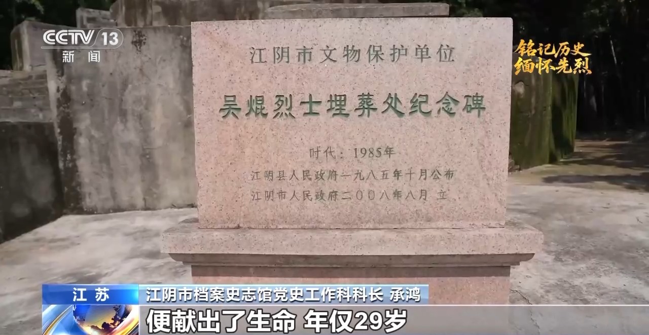 江陰市檔案史志館黨史工作科科長 承鴻:他率領(lǐng)部隊進軍的時候,遭到了國民黨軍隊的冷槍,吳焜頭部中彈,未及留下只言片語,便獻出了生命,年僅29歲。吳焜參加過長征,歷經(jīng)艱難險阻,在作戰(zhàn)和訓(xùn)練當(dāng)中,處處以身作則,率先垂范。他指揮作戰(zhàn)時經(jīng)常沖在第一線,非常勇猛,正是依靠這種精神和作風(fēng),讓新四軍成為鐵軍。
