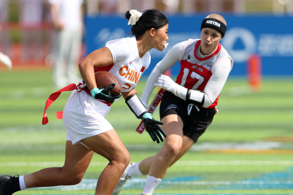8月14日,在2025年成都世運(yùn)會腰旗橄欖球女子預(yù)賽A組比賽中,中國隊45:47不敵奧地利隊。圖為中國隊球員高子旋(左)在比賽中。新華社記者 陳斌 攝