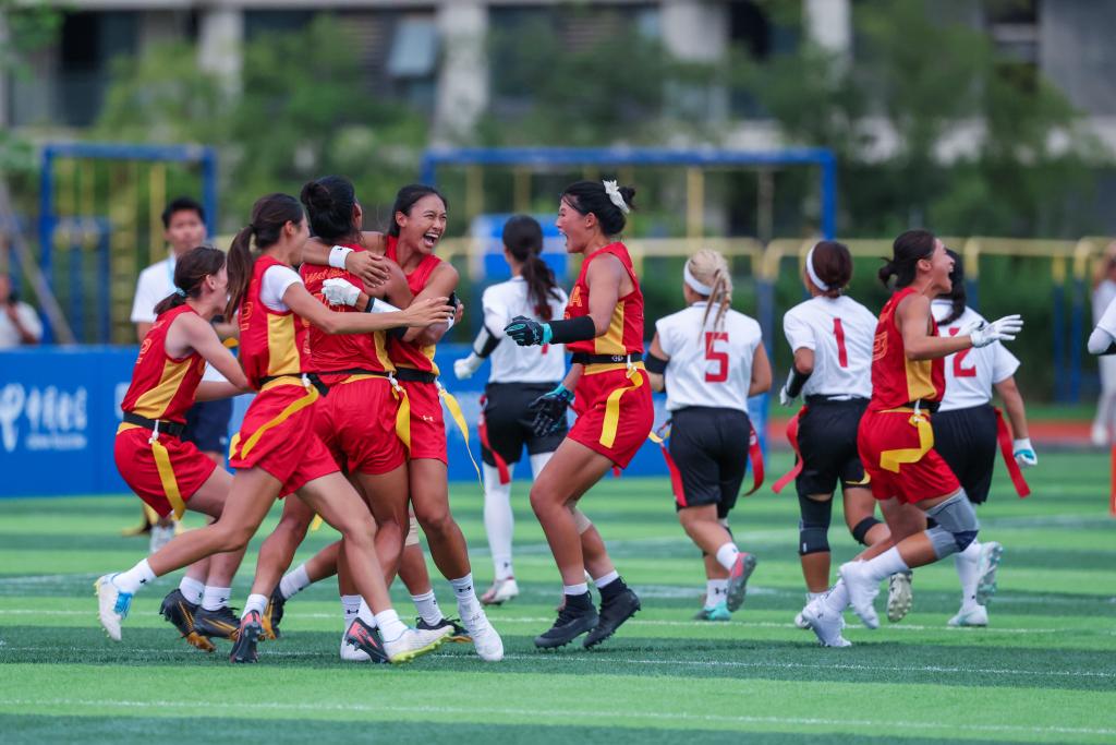 8月16日,中國(guó)隊(duì)球員在賽后慶祝勝利。當(dāng)日,在2025年成都世運(yùn)會(huì)腰旗橄欖球女子5-8名安慰賽半決賽中,中國(guó)隊(duì)?wèi)?zhàn)勝日本隊(duì)。新華社記者 魏翔 攝