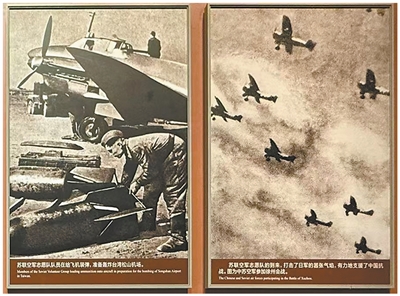 中國人民抗日戰(zhàn)爭(zhēng)紀(jì)念館中展示的蘇聯(lián)援華航空隊(duì)老照片。左側(cè)照片為蘇聯(lián)援華航空隊(duì)成員為飛機(jī)裝彈,準(zhǔn)備轟炸被日軍占領(lǐng)的臺(tái)北松山機(jī)場(chǎng)。右側(cè)照片為1938年中蘇空軍參加徐州會(huì)戰(zhàn)。
