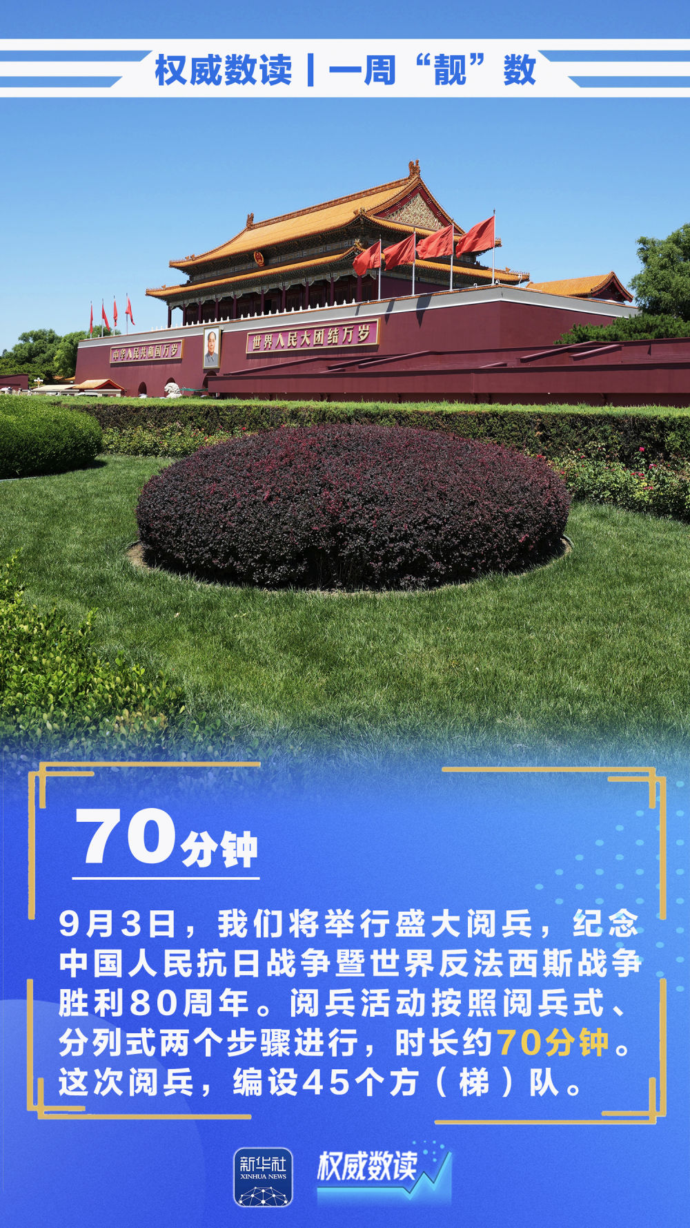 即將到來的九三閱兵活動按照閱兵式、分列式兩個步驟進行,時長約70分鐘;我國外貿(mào)保持穩(wěn)中有進態(tài)勢,累計進出口增速逐月回升,前7個月實現(xiàn)3.5%的增長;今年前7個月,我國對上海合作組織其他成員國進出口2.11萬億元,規(guī)模創(chuàng)歷史同期新高……本周這些數(shù)據(jù),最值得關(guān)注!