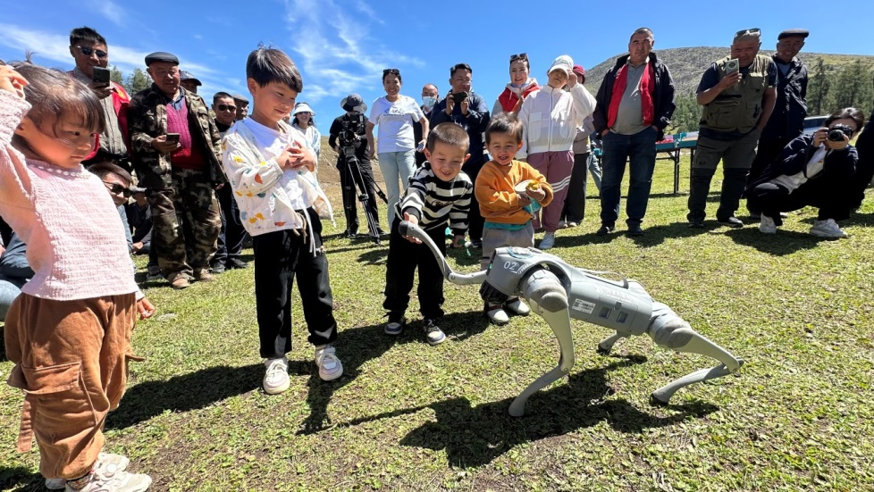 科普大篷車開進(jìn)新疆阿勒泰青河縣套查干湖夏牧場,當(dāng)?shù)匦∨笥押蜋C(jī)器狗互動(dòng)。(新疆科技館供圖)