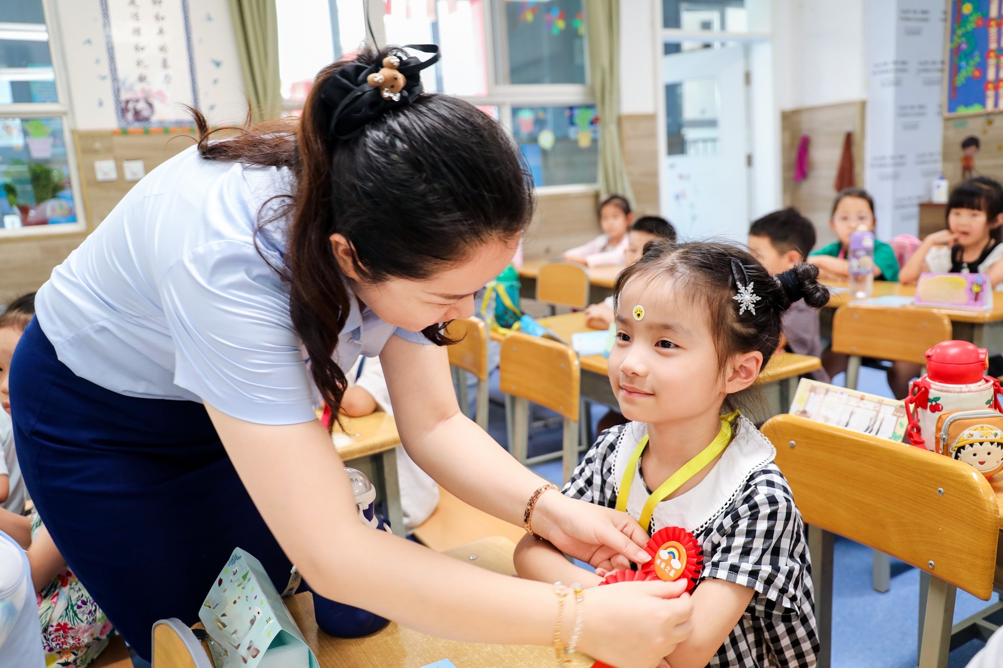 老師為新生帶上獎勵的“小勛章”(央廣網(wǎng)發(fā) 西安高新第八小學供圖)