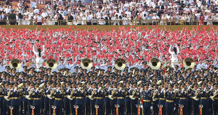 ↑9月3日,紀(jì)念中國人民抗日戰(zhàn)爭暨世界反法西斯戰(zhàn)爭勝利80周年大會在北京隆重舉行。這是中國人民解放軍聯(lián)合軍樂團和合唱團。新華社記者 劉衛(wèi)兵 攝