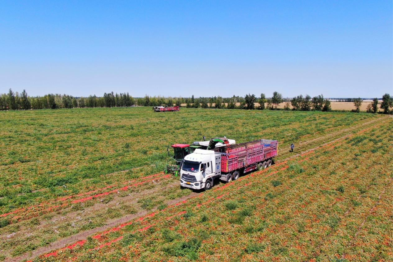 吉木薩爾縣三臺(tái)鎮(zhèn)的1200余畝加工番茄迎來了豐收季。在羊圈臺(tái)子村,種植戶俞瑞海家的300畝番茄地里,現(xiàn)代化采收機(jī)械正來回穿梭。