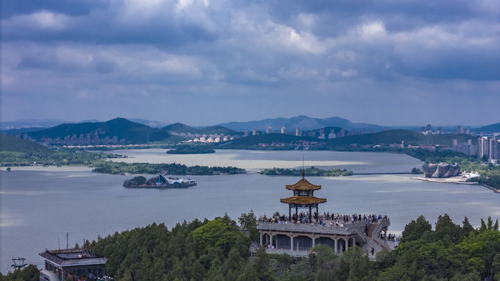 游客在江蘇徐州云龍湖的觀景臺上欣賞美景。白雪 攝