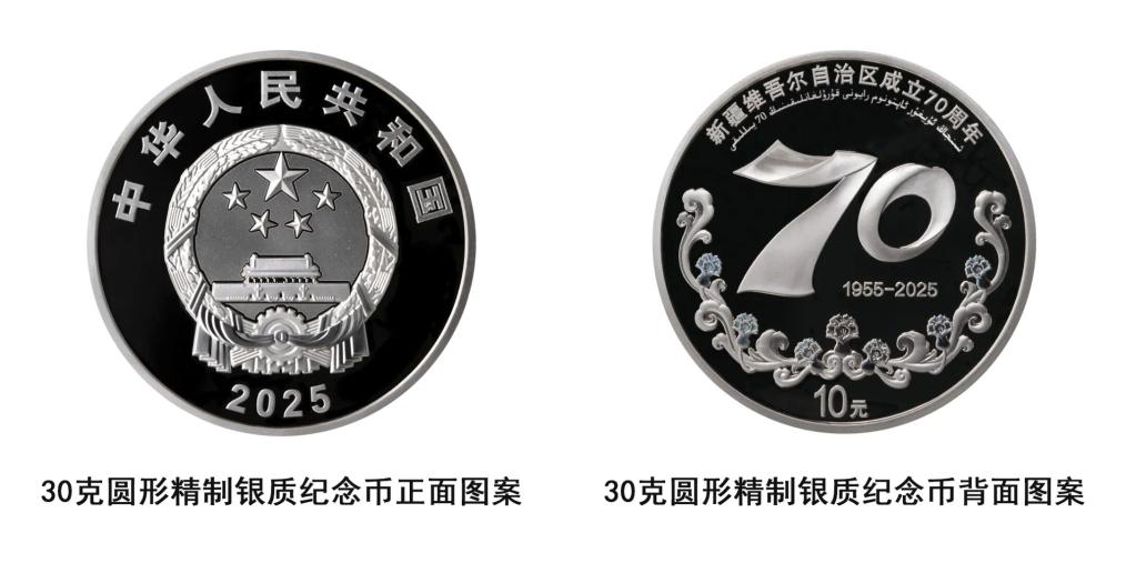 記者9月16日從中國人民銀行獲悉,中國人民銀行定于9月19日發(fā)行新疆維吾爾自治區(qū)成立70周年金銀紀念幣一套。該套金銀紀念幣共2枚,其中金質(zhì)紀念幣1枚,銀質(zhì)紀念幣1枚,均為中華人民共和國法定貨幣。