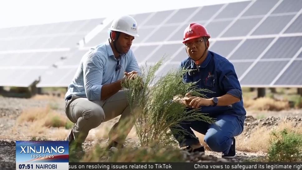 外籍主持人林肯探訪了全球最大的“草光互補(bǔ)”光伏基地——阿合雅光伏產(chǎn)業(yè)園。這片由181萬塊光伏板組成的藍(lán)色海洋,占地493公頃,相當(dāng)于700個(gè)標(biāo)準(zhǔn)足球場(chǎng)。不僅能夠提供滿足約43萬人全年用電需求,還兼具治沙功效。中國(guó)華能集團(tuán)烏什光伏電站負(fù)責(zé)人周博表示,這類光伏設(shè)施能夠穩(wěn)固土壤、防止侵蝕,板面凝結(jié)的水珠還可灌溉下方土地,支持植物持續(xù)生長(zhǎng)?!案瓯谄孥E”的背后,是國(guó)家實(shí)現(xiàn)“雙碳”目標(biāo)而推動(dòng)的生態(tài)與能源的“雙向奔赴”。