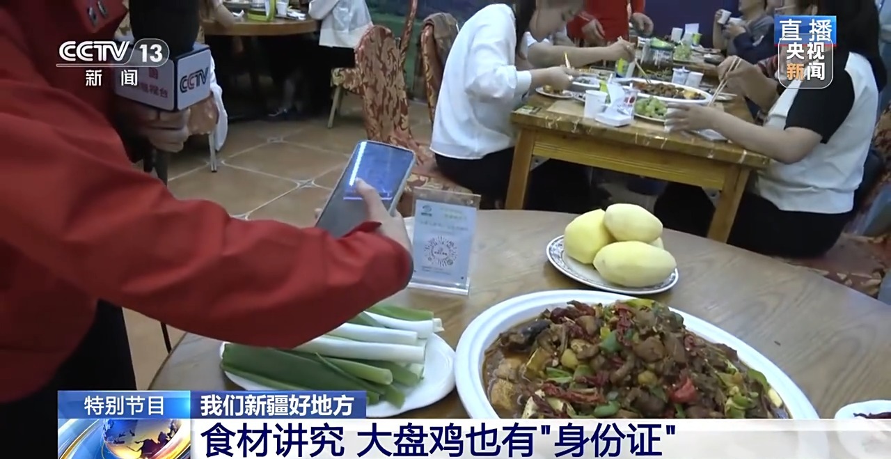 其實,大盤雞里的每一種原料,都是新疆農(nóng)業(yè)發(fā)展的縮影。先說這最主要的雞肉,是來自當(dāng)?shù)貥?biāo)準(zhǔn)化散養(yǎng)的土雞,這可不是一般的雞,它讓大盤雞有了“電子身份證”,我們來掃碼看看。