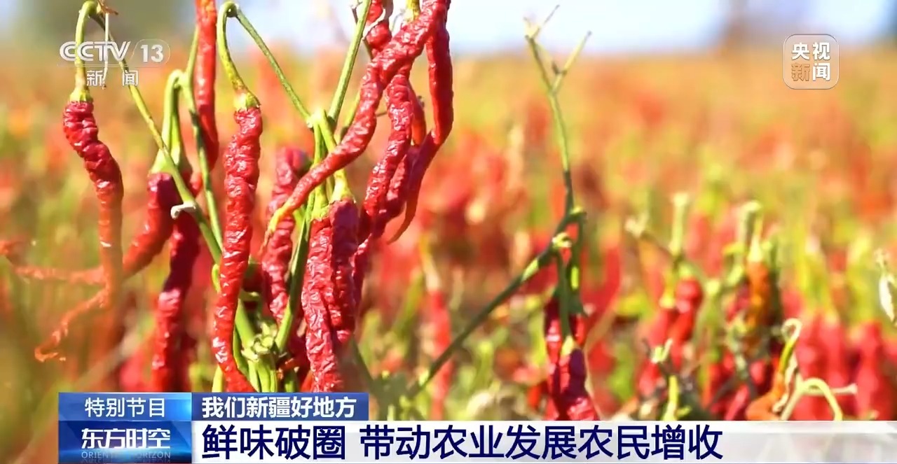 說完了主角,再來說說配菜。這里面的土豆來自博爾通古鄉(xiāng)。最關(guān)鍵的辣椒,是當(dāng)?shù)氐闹饕r(nóng)作物,來自“辣椒之鄉(xiāng)”安集海鎮(zhèn)。過去這里的辣椒只是農(nóng)民零散種植,如今已經(jīng)形成了從育種、種植、加工到銷售的完整產(chǎn)業(yè)鏈。這些辣椒不僅給大盤雞“注入靈魂”,也滿足了全國的餐桌需求,還出口到韓國、日本等地。