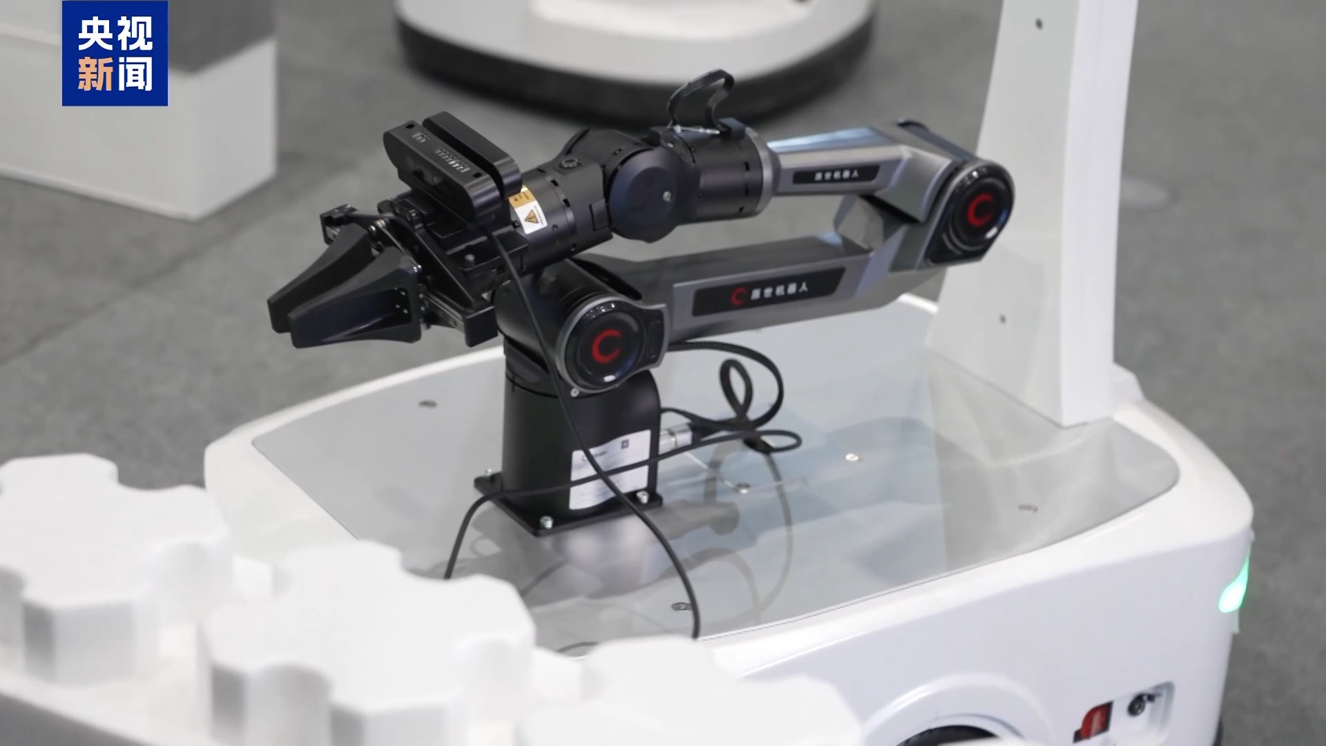 在自主移動機器人賽項記者看到,隨著一串代碼輸入,幾臺機器人揮動機械臂,抓取、抬升,一件件模擬水果被快速摘下運送到指定地點。