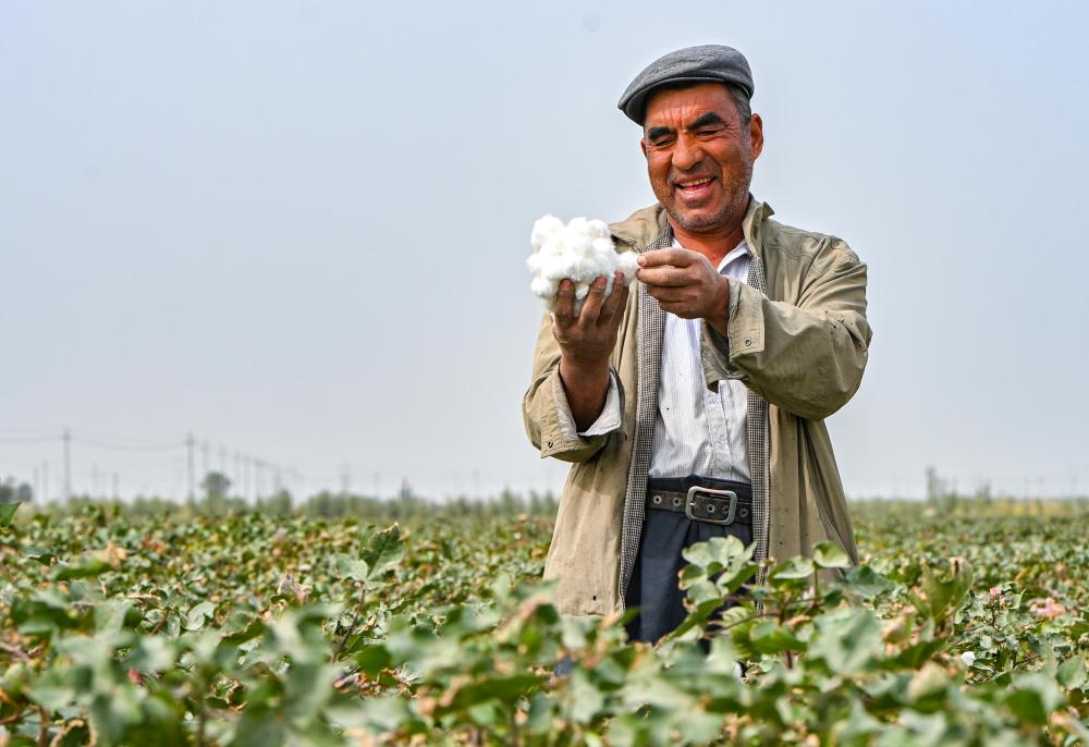9月19日,尉犁縣達(dá)西村二組村民艾合買提·吐?tīng)栠d在棉田里查看棉花。
