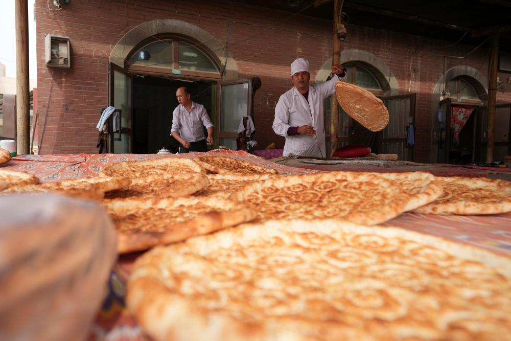 9月19日,達(dá)西村村民肉則·賽麥提(右)在文旅商業(yè)街上制作馕。近年來(lái),達(dá)西村打造文旅商業(yè)街,吸引村民入駐,為村民增收。