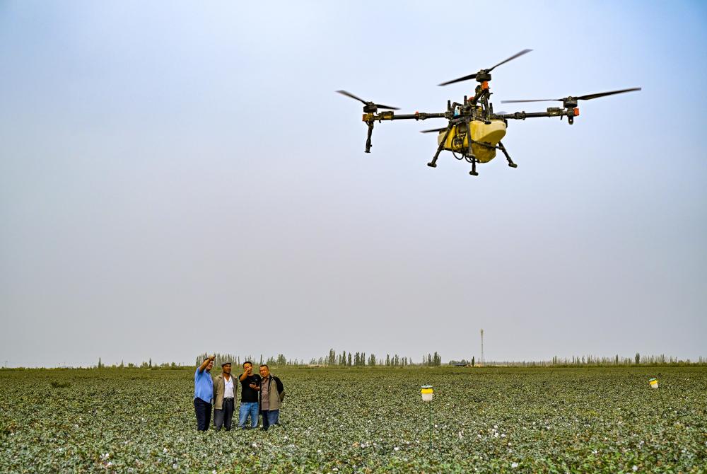 9月19日,極飛超級(jí)棉田負(fù)責(zé)人艾海鵬(右二)在尉犁縣的示范棉田里為達(dá)西村村民進(jìn)行智能無(wú)人機(jī)灑藥培訓(xùn)。無(wú)人化智慧農(nóng)場(chǎng)應(yīng)用農(nóng)業(yè)無(wú)人機(jī)、農(nóng)業(yè)無(wú)人車、遙感無(wú)人機(jī)、農(nóng)機(jī)自駕儀等系列物聯(lián)設(shè)備實(shí)施“水肥一體化”管理,農(nóng)民用一部手機(jī)即可操作智能設(shè)備完成多項(xiàng)田間管理工作。