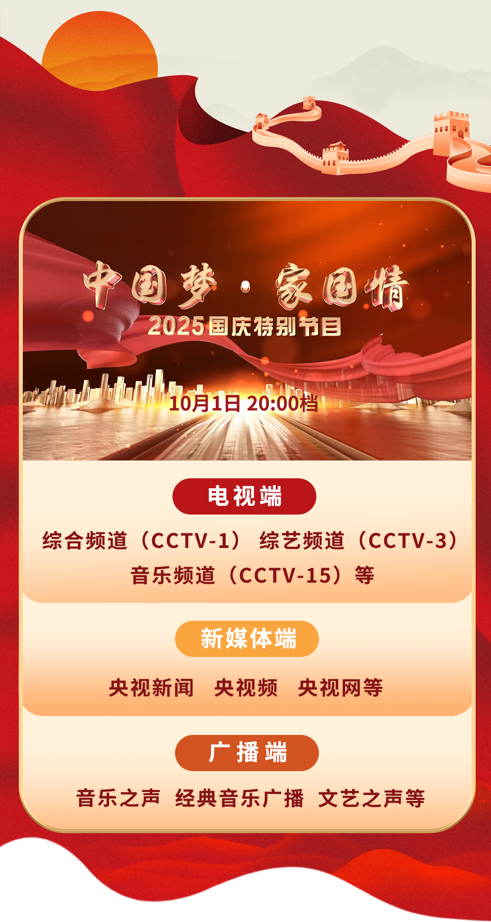 金秋潑彩山河醉,家國(guó)同輝氣象新。10月1日晚八點(diǎn),《中國(guó)夢(mèng) 家國(guó)情——2025國(guó)慶特別節(jié)目》將在《我愛你中國(guó)》的大合唱中拉開大幕。特別節(jié)目走進(jìn)城市地標(biāo)與文化遺址,展現(xiàn)山河新貌與奮斗者群像。經(jīng)典曲目、交響合唱、新創(chuàng)歌曲傳遞濃濃家國(guó)情懷??箲?zhàn)老兵、奧運(yùn)冠軍、各行各業(yè)奮斗者深情講述……整場(chǎng)節(jié)目,洋溢著中華民族偉大復(fù)興勢(shì)不可擋的壯志豪情。