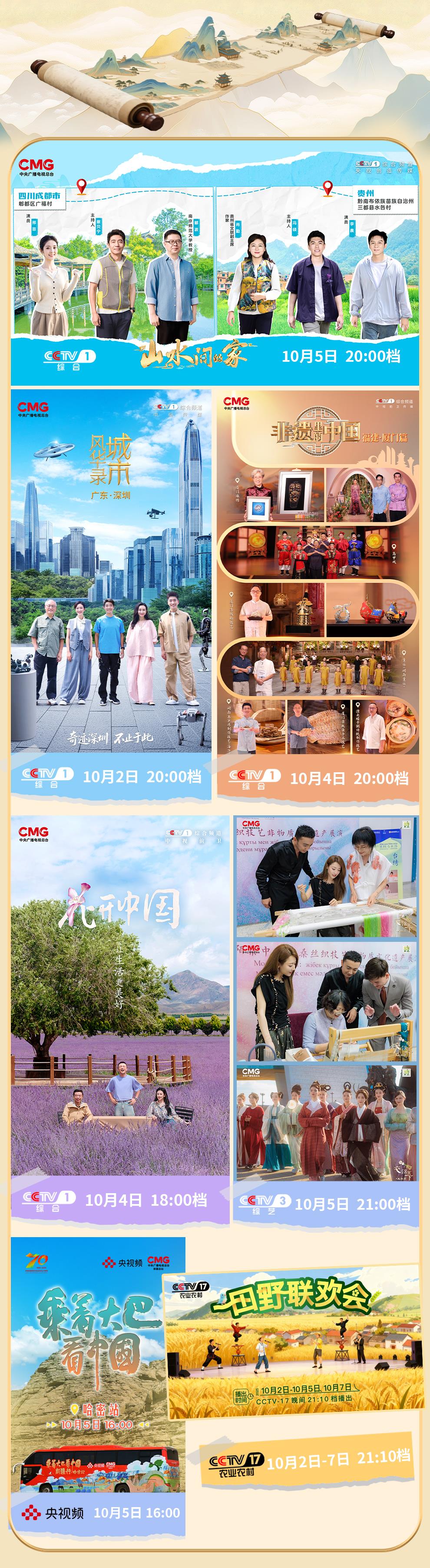 八天假期,想好去哪兒玩了嗎?來(lái),跟著總臺(tái)去打卡!頭兩站:四川、貴州!《山水間的家(第四季)》“山水小分隊(duì)”邀你在川西林盤探韭香產(chǎn)業(yè),在黔南山鄉(xiāng)看巖椒成林。第三站:廣東。《城市風(fēng)華錄》帶你去深圳探訪全球首家機(jī)器人6S店,感受“奇跡之城”向新向好的澎湃動(dòng)力。第四站:福建。珠繡、漆線雕、閩南童謠、高甲戲……看《非遺里的中國(guó)》,領(lǐng)略廈門非遺之美。第五站:新疆。從《花開中國(guó)》開啟一場(chǎng)跨越天山的芬芳之旅,在《衣錦天下 絲路季》發(fā)現(xiàn)絲綢之路上的中國(guó)審美,《乘著大巴游中國(guó)》探尋哈密甜美密碼。第六站:內(nèi)蒙古。在通遼參加《田野聯(lián)歡會(huì)》,體驗(yàn)鄉(xiāng)土文化新活力。這八天的旅程,你不會(huì)錯(cuò)過(guò)雄奇的風(fēng)光、古老的文化、新奇的創(chuàng)造,還有熱氣騰騰的生活。
