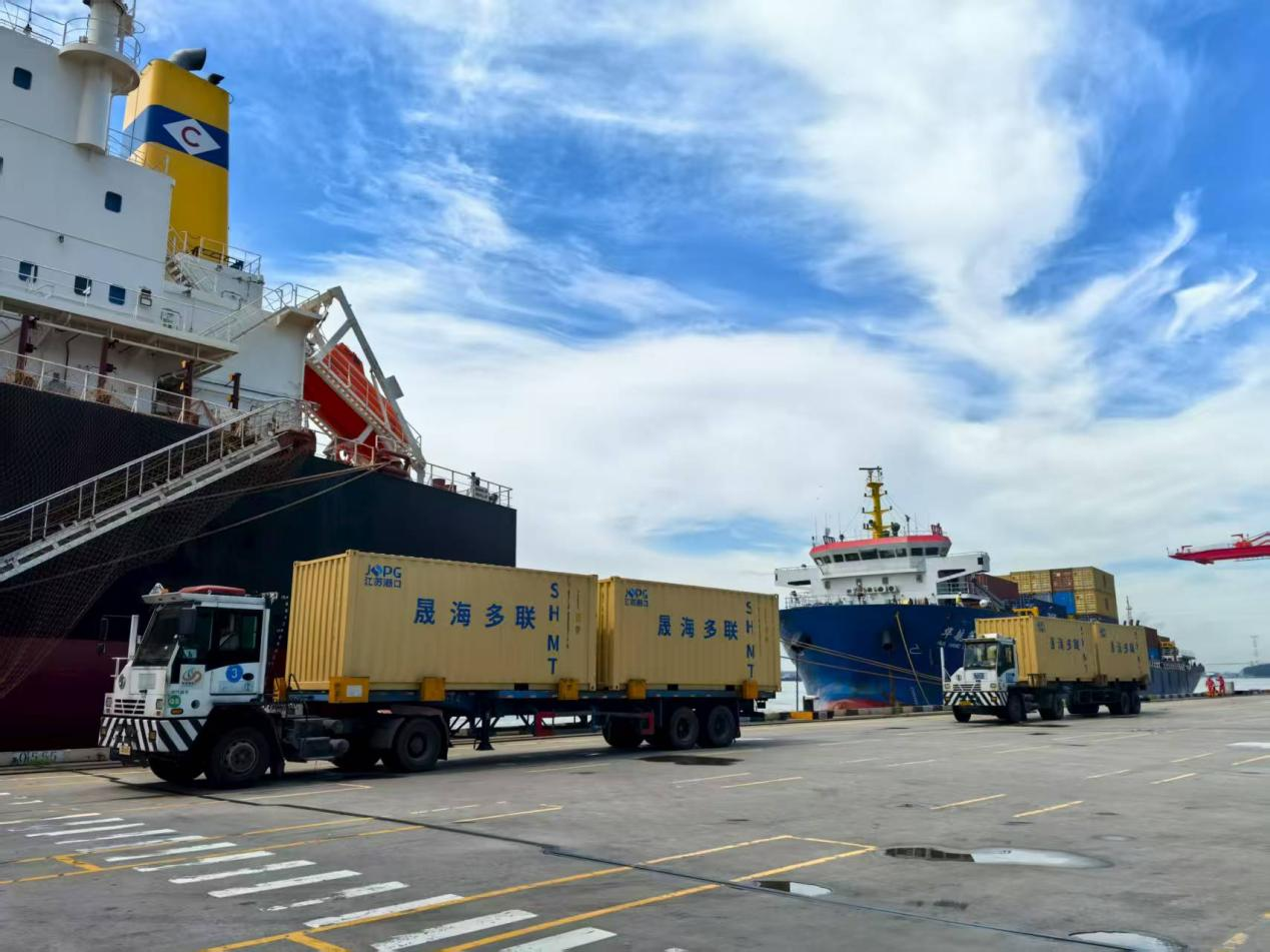 “傳統(tǒng)車皮運輸需多次倒裝,損耗率高、成本大。我們創(chuàng)新采用35噸敞頂箱替代車皮,鐵路直發(fā)龍?zhí)陡酆笸ㄟ^專用吊具直接拆箱裝船,全程貨物不落地、零損耗,每年節(jié)省物流成本近2000萬元?!标珊9究偨?jīng)理管俊俊向記者介紹。