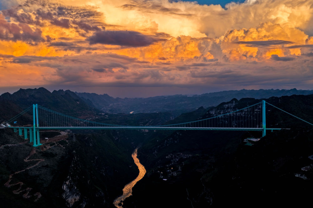 這是9月28日拍攝的夕陽(yáng)下的貴州花江峽谷大橋(無人機(jī)照片)。新華社記者 楊文斌 攝