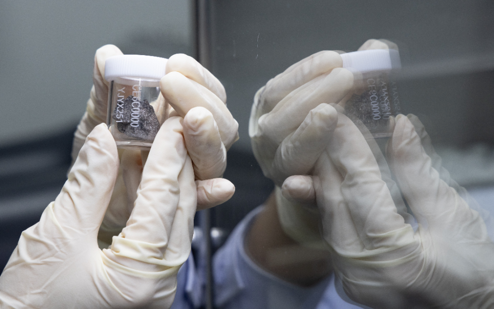 科研人員在月球樣品實(shí)驗(yàn)室展示嫦娥六號月球樣品。新華社記者 金立旺 攝