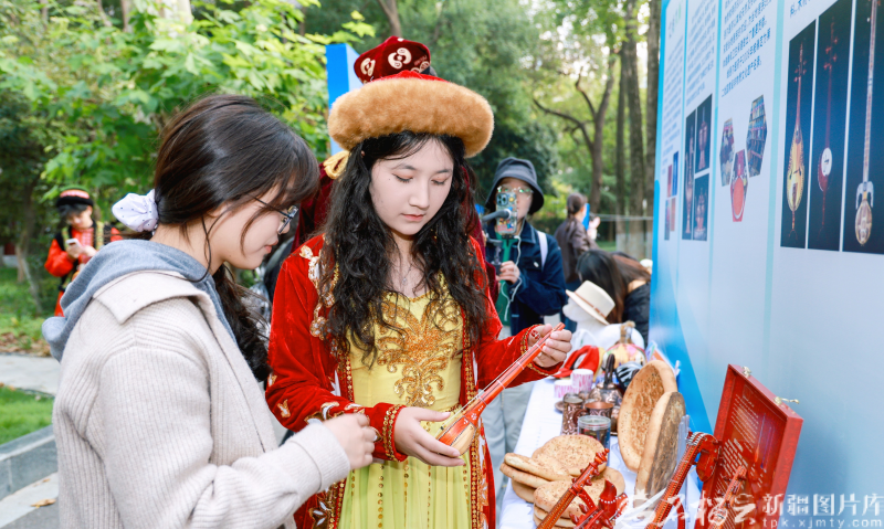 10月27日下午,南京師范大學(xué)(隨園校區(qū))學(xué)生在欣賞新疆樂器。石榴云/新疆日報記者 甘興華攝
