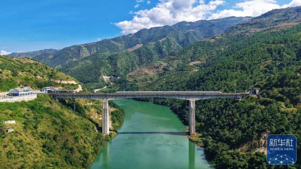 ↑ 10月30日,一列動(dòng)車(chē)組列車(chē)經(jīng)過(guò)小灣東站(無(wú)人機(jī)照片)。
