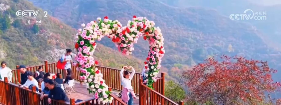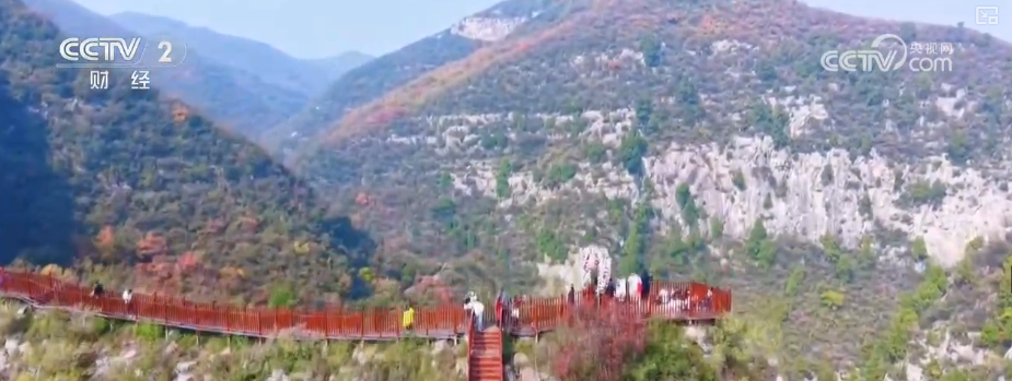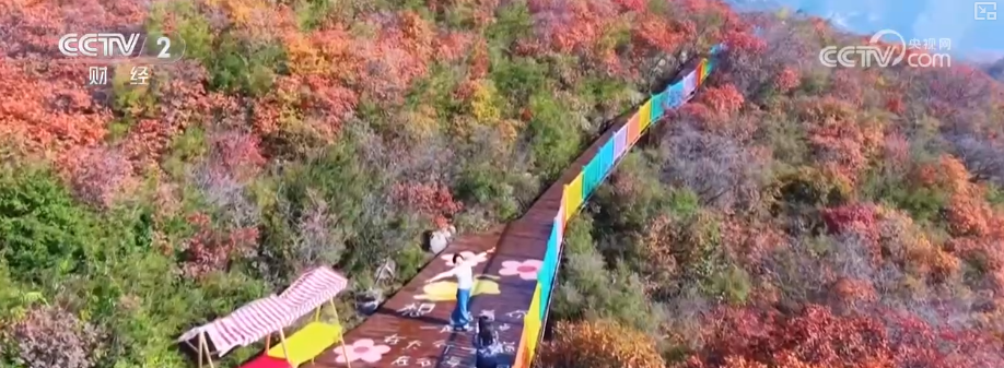 這里新落成的五彩步道全長1300米,沿山脊蜿蜒鋪展,如一條絢爛彩帶鑲嵌于山間,每百米便有一處景致,步移景異。游客既能賞紅葉爛漫、覽太行雄姿,亦可于登高望遠處邂逅一場秋日視覺盛宴。