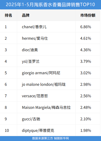 這一態(tài)勢(shì)在香水品類的重要銷售渠道淘系平臺(tái)(淘寶+天貓)的數(shù)據(jù)中也有所體現(xiàn)。國(guó)際大牌牢牢占據(jù)淘系平臺(tái)香水品牌銷售前十。數(shù)據(jù)顯示,2025年1-5月,榜單前十仍由香奈兒、圣羅蘭、祖瑪瓏等國(guó)際大牌壟斷。