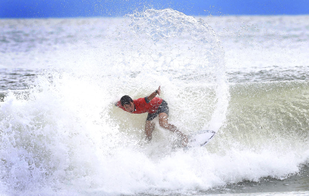 2025年11月13日,福建隊(duì)選手陳丙寅在廣東汕頭舉行的第十五屆全國(guó)運(yùn)動(dòng)會(huì)沖浪男子短板第一輪比賽中。新華社記者盧漢欣攝