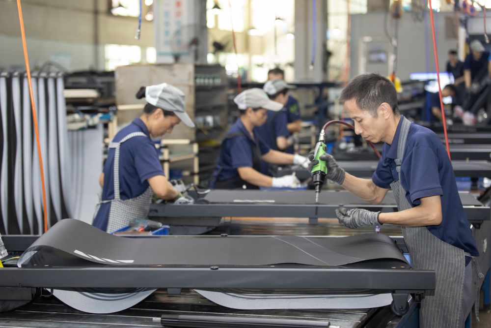 2025年9月12日,福建晉江一家體育器材工廠的工人在車(chē)間流水線上組裝跑步機(jī)。新華社發(fā)(連靜毅 攝)
