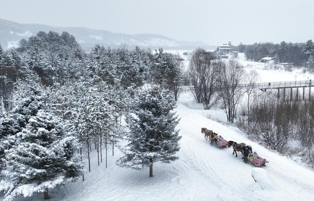 2024年11月27日,游客在黑龍江省漠河市北極村體驗(yàn)馬拉爬犁項(xiàng)目(無(wú)人機(jī)照片)。新華社發(fā)(徐率 攝)
