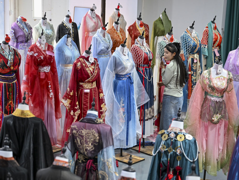 2025年6月17日,在山東省菏澤市曹縣有愛(ài)云倉(cāng)漢服基地,工作人員直播推介漢服。新華社記者 徐嘉懿 攝