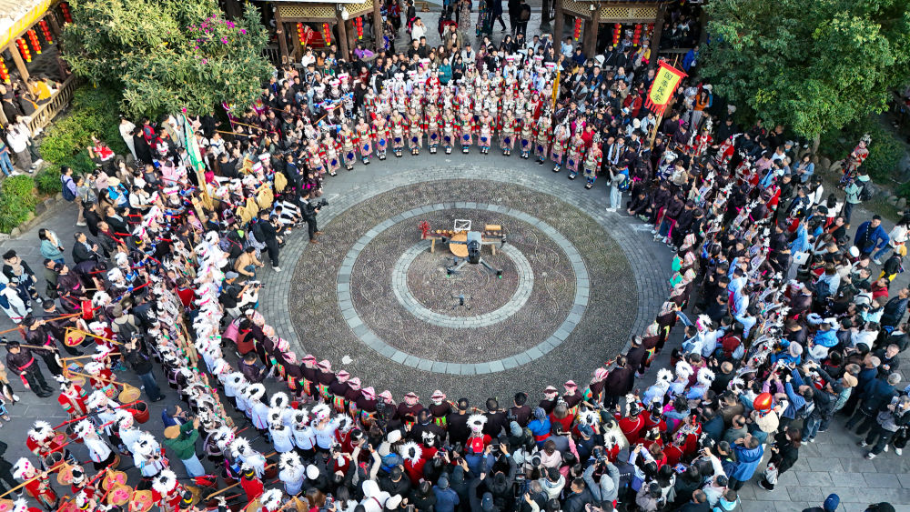 2024年11月30日,侗族群眾在貴州省黔東南苗族侗族自治州黎平縣肇興侗寨進(jìn)行文藝表演(無(wú)人機(jī)照片)。新華社發(fā)(王純亮 攝)
