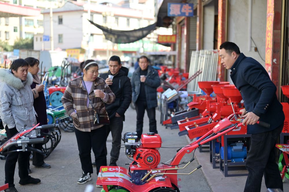 2025年2月9日,在湖南省婁底市雙峰縣農(nóng)機(jī)市場(chǎng),農(nóng)戶在選購(gòu)小農(nóng)機(jī)。新華社發(fā)(李建新 攝)