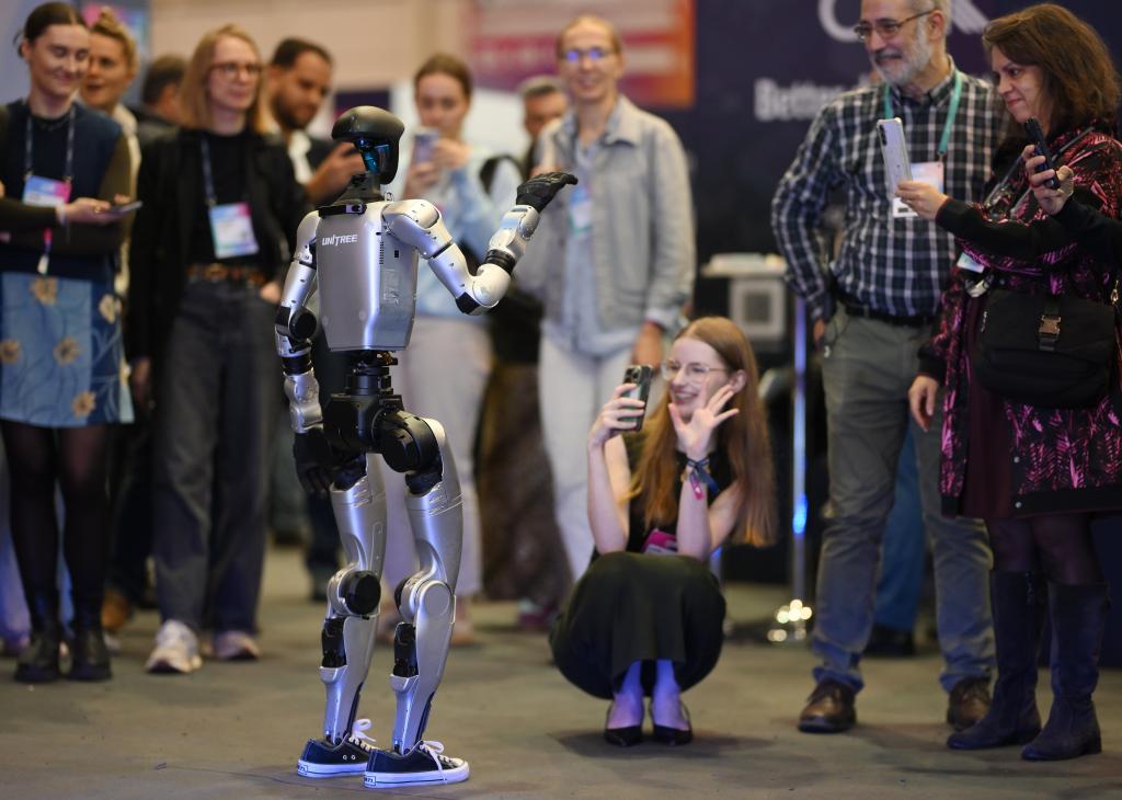 2025年11月12日,在葡萄牙里斯本,中國企業(yè)宇樹科技的人形機(jī)器人和與會者在2025年網(wǎng)絡(luò)峰會現(xiàn)場互動(dòng)。新華社發(fā)