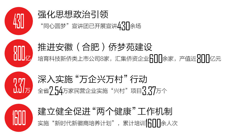 堅(jiān)持和落實(shí)“兩個(gè)毫不動(dòng)搖”,建立健全促進(jìn)“兩個(gè)健康”工作機(jī)制。持續(xù)優(yōu)化民營(yíng)經(jīng)濟(jì)發(fā)展環(huán)境,促進(jìn)經(jīng)濟(jì)社會(huì)高質(zhì)量發(fā)展。召開全省民營(yíng)經(jīng)濟(jì)統(tǒng)戰(zhàn)工作會(huì)議,明確36項(xiàng)重點(diǎn)任務(wù)和55家責(zé)任單位,建立13家省直單位組成的聯(lián)席會(huì)議制度。聚焦凝心鑄魂,全省統(tǒng)戰(zhàn)系統(tǒng)累計(jì)開展理想信念教育和經(jīng)濟(jì)形勢(shì)政策教育808場(chǎng)次,覆蓋3.82萬人次民營(yíng)經(jīng)濟(jì)人士。突出年輕一代培育,實(shí)施“新時(shí)代新徽商培養(yǎng)計(jì)劃”,累計(jì)培訓(xùn)1600余人次,建立約2500人的代表人士數(shù)據(jù)庫(kù),推動(dòng)青年商會(huì)組織省市全覆蓋,推薦4300余名優(yōu)秀青年企業(yè)家進(jìn)入各級(jí)人大、政協(xié)。引導(dǎo)企業(yè)履行社會(huì)責(zé)任,完成光彩事業(yè)發(fā)起實(shí)施30周年相關(guān)調(diào)研及先進(jìn)典型推薦宣傳工作。