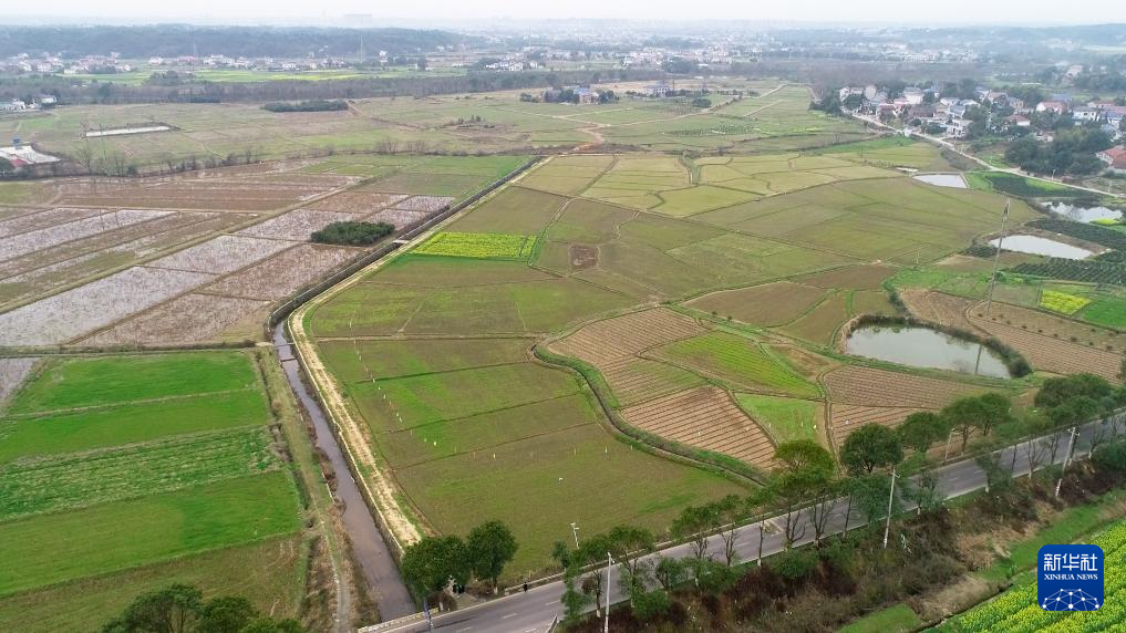這是2023年3月10日拍攝的瀏陽市永安鎮(zhèn)豐裕村改良后耕地上的油菜花(無人機照片)。新華社發(fā)