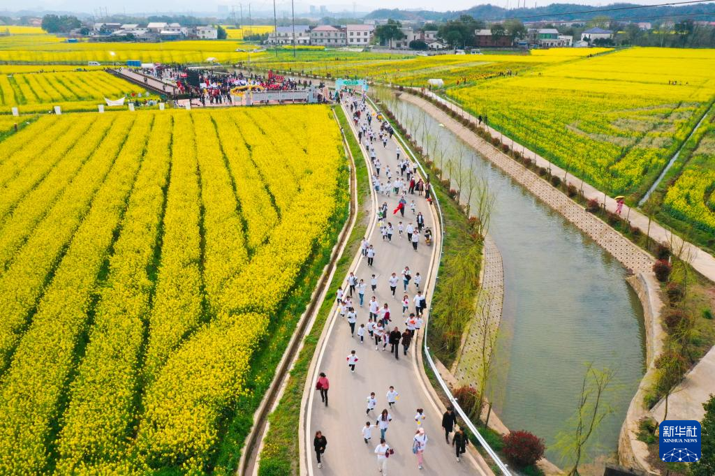 2024年3月22日,瀏陽市永安鎮(zhèn)豐裕村舉辦的油菜花節(jié),村民和游客參加花田鄉(xiāng)野跑活動(無人機照片)。新華社發(fā)