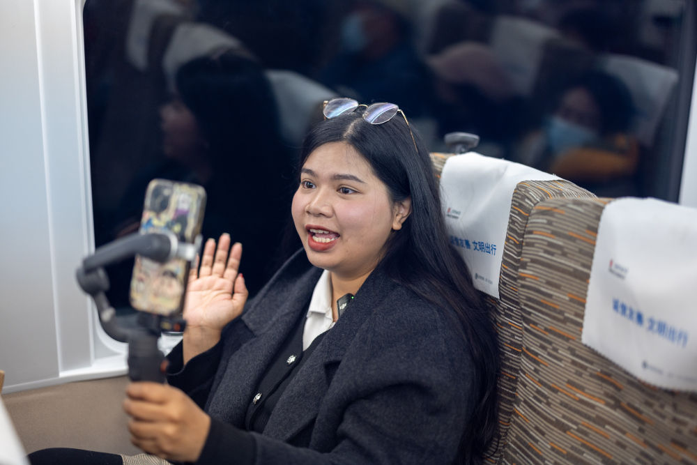 2025年2月21日,泰國博主李佩英在中國拍攝體驗復興號高鐵列車。新華社記者 黃偉 攝